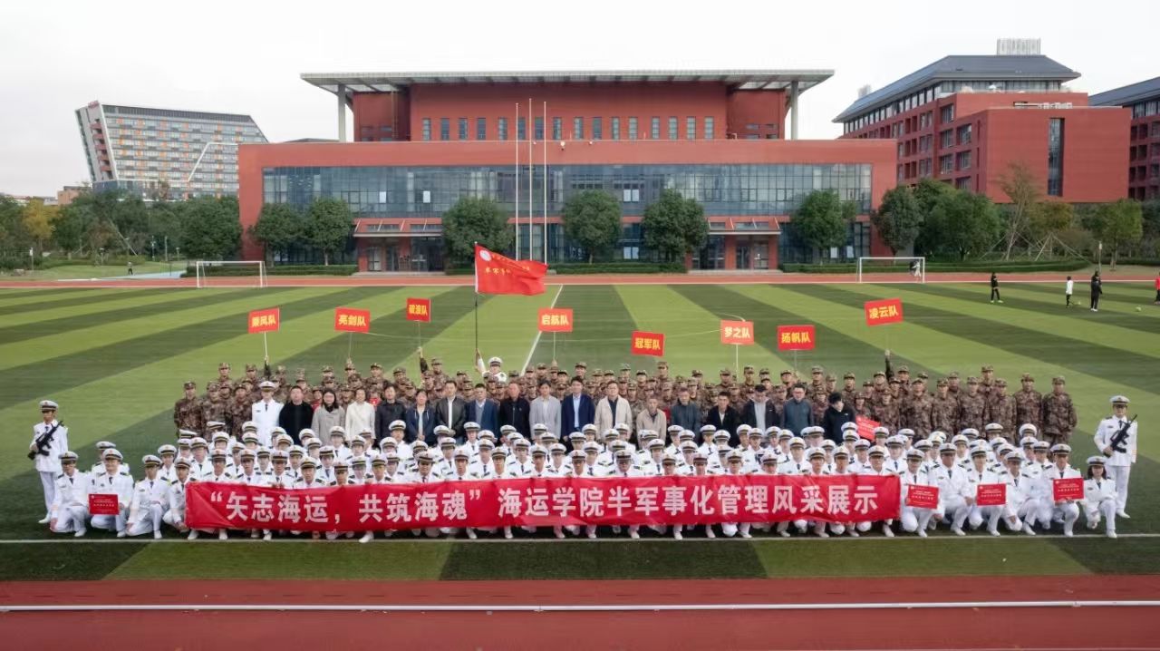 11月20日,91porn 在梅山校区操场隆重举行了以“矢志海运,共筑海魂”为主题的半军事化管理风采展示活动。学院党委书记刘忠秀、梅山校区管委会副主任吕建慧、学院党委副书记张宾、党委委员陈跃华、工会主席苗鹤,以及梅山校区保卫部的陈红军、谢雨龙等多位学院领导和老师莅临参与。同时,学院系主任、退休老教师代表、青年教师代表、行政教辅老师,以及半军事化管理大队的学生教官和全体学员也齐聚一堂,共同见证了这一盛况。
