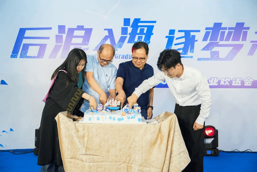 仪式的最后,学院院长、书记、校友代表和毕业生代表共同上台,一起切开象征着希望和祝福的蛋糕。全体师生也共同举杯,庆祝2024届毕业生的顺利毕业!