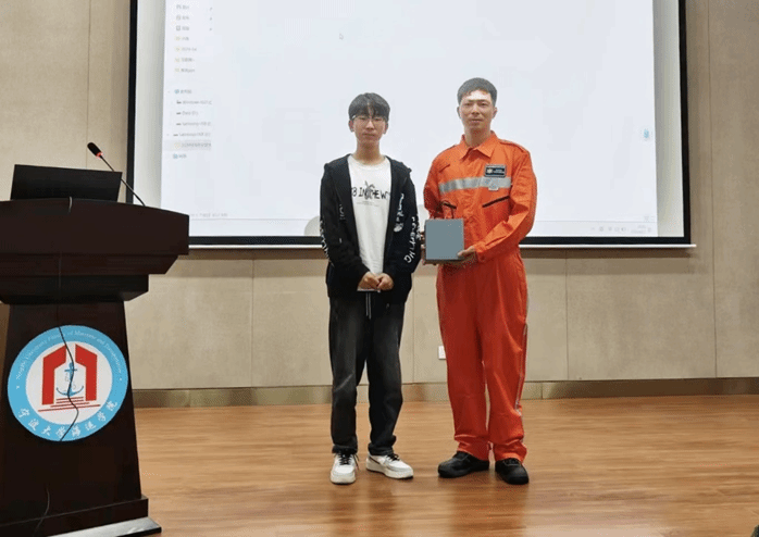 王队长在发言中也回忆了东海救助事业曾遇到的困难,以及现如今在各方帮助下的快速发展。最后,他鼓励和祝福更多的同学加入救助队,选择一个与众不同的青春。在场的同学在了解到救助队的重要性与必要性后,对这样辛苦却又光荣的工作也心生向往。学生代表也为王队长送上纪念品,希望日后还有机会一起交流学习。