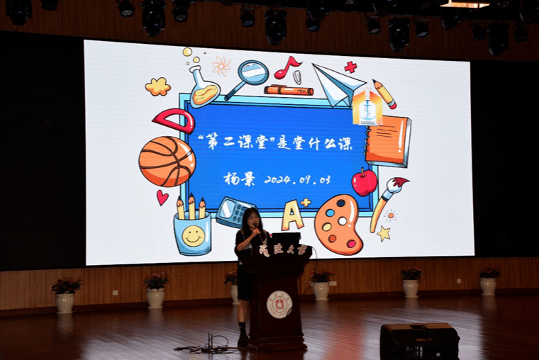 杨景老师详细向同学们介绍了第二课堂的内容。她强调了第二课堂在培养学生综合素质方面的重要性,并介绍了学校丰富多彩的第二课堂活动,包括学术讲座、创新创业比赛、志愿服务等。杨景老师鼓励新生们积极参与第二课堂,拓宽视野,提升能力。