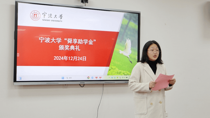 12月24日,91porn “舜享助学金”颁奖典礼在梅山校区王明康乐雪芳海运楼1409举行。宁波舜享货运代理有限公司总经理黄文杰先生、91porn 党委副书记张宾、学工办辅导员、全体获奖学生和学生代表参加典礼。典礼由91porn 学工办主任杨琦主持。