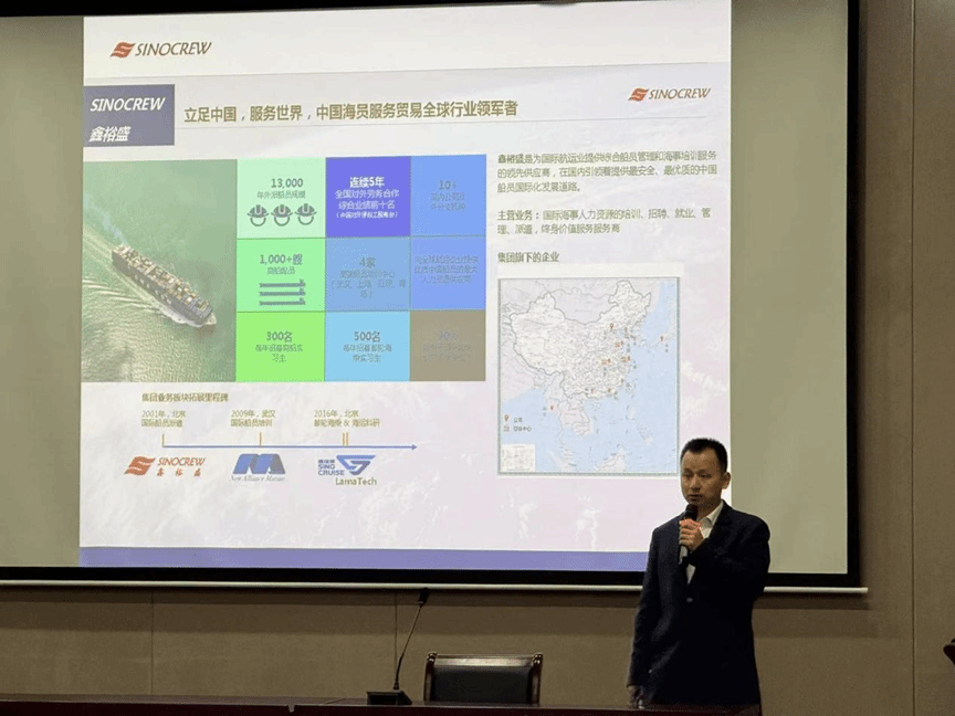 北京鑫裕盛船舶管理有限公司作为业内具有一定影响力的企业,专注于船舶管理、航运服务及相关技术领域,拥有丰富的行业经验和广泛的国际资源。唐经理以生动的案例、直观的数据为切入点,向学生展示了船舶管理行业的广阔前景与技术发展方向。他们从行业现状分析、科技进步驱动的管理模式转变、国际船运市场的新机遇等多个角度,全面解读了船舶管理行业的未来发展趋势。