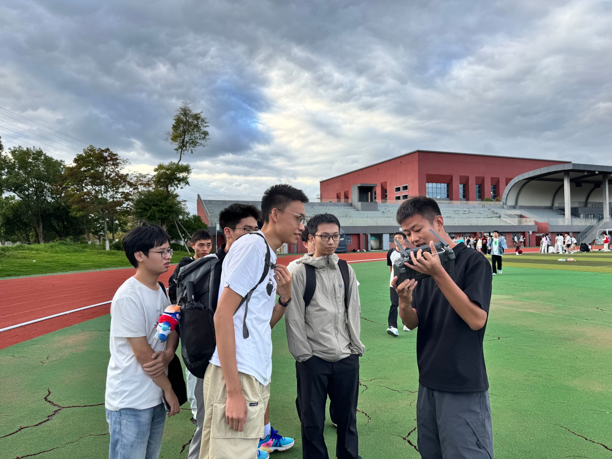 在实景飞行操控环节,学生在专业老师的指导下,严格按照航空安全规范,完成无人机起飞前的设备检查等流程,专业老师演示了无人机悬停、航线飞行、定点降落等科目训练。进一步介绍了“航拍测绘”“应急物资投送” 等应用场景的操作,通过现场点评和飞行综合评估,确保每一位参与学生都能对无人机安全飞行有一个直观的感受